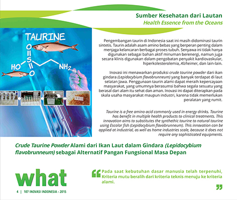 Sumber Kesehatan dari LautanHealth Essence from the OceansCrude Taurine Powder Alami dari Ikan Laut dalam Gindara (Lepidocybium flavobrunneum) sebagai Alternatif Pangan Fungsional Masa Depan Status Paten: Dalam Proses Pengajuan Kesiapan Inovasi: Kerjasama Bisnis: * Terbatas Peringkat Inovasi: * Terbatas | |