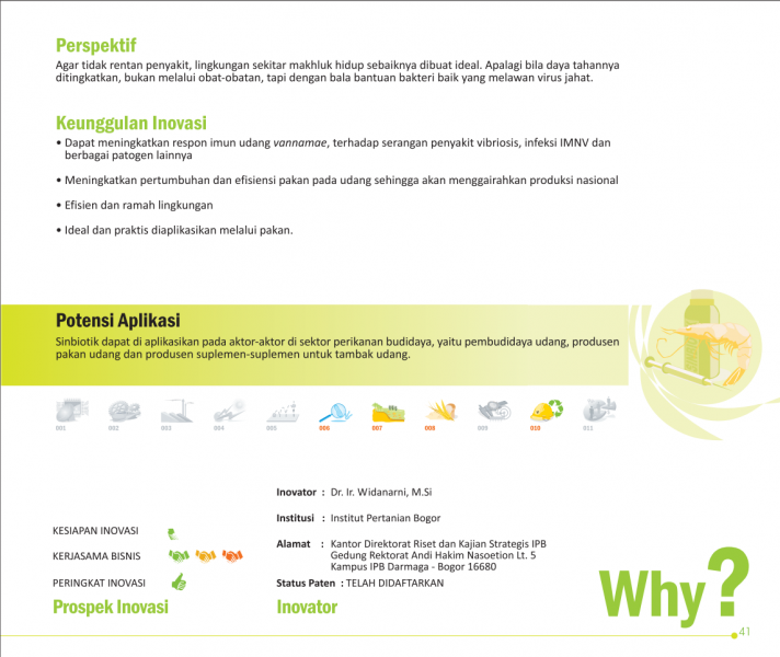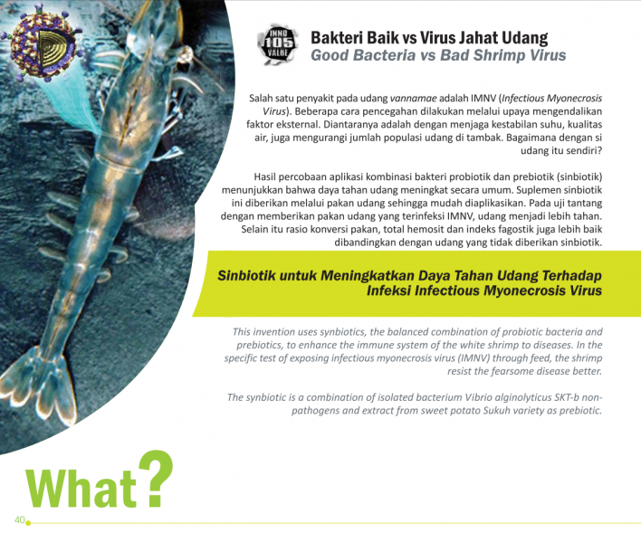 Bakteri Baik vs Virus Jahat UdangGood Bacteria vs Bad Shrimp VirusSinbiotik untuk Meningkatkan Daya Tahan Udang Terhadap Infeksi Infectious Myonecrosis Virus Status Paten: Telah Terdaftar Kesiapan Inovasi: * Prototype Kerjasama Bisnis: *** Terbuka Peringkat Inovasi: *** Terbuka | |