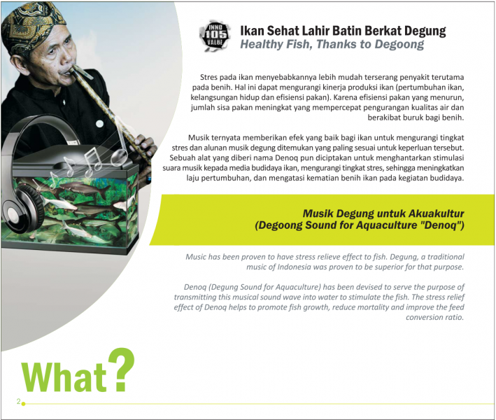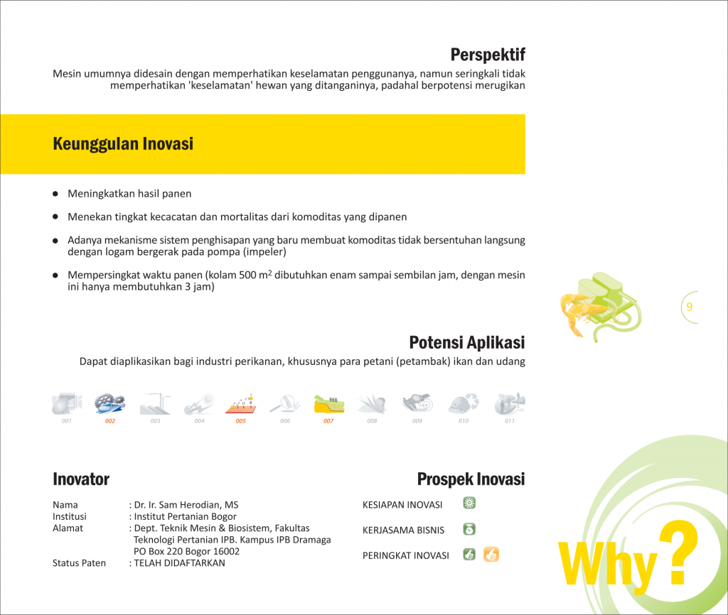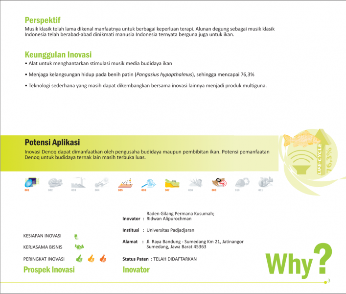 Spionase Bawah AirUnderwater EspionageSuara Ikan Menentukan Produktifitasnya Status Paten: Dalam Proses Pengajuan Kesiapan Inovasi: * Prototype Kerjasama Bisnis: * Terbatas Peringkat Inovasi: * Terbatas | |