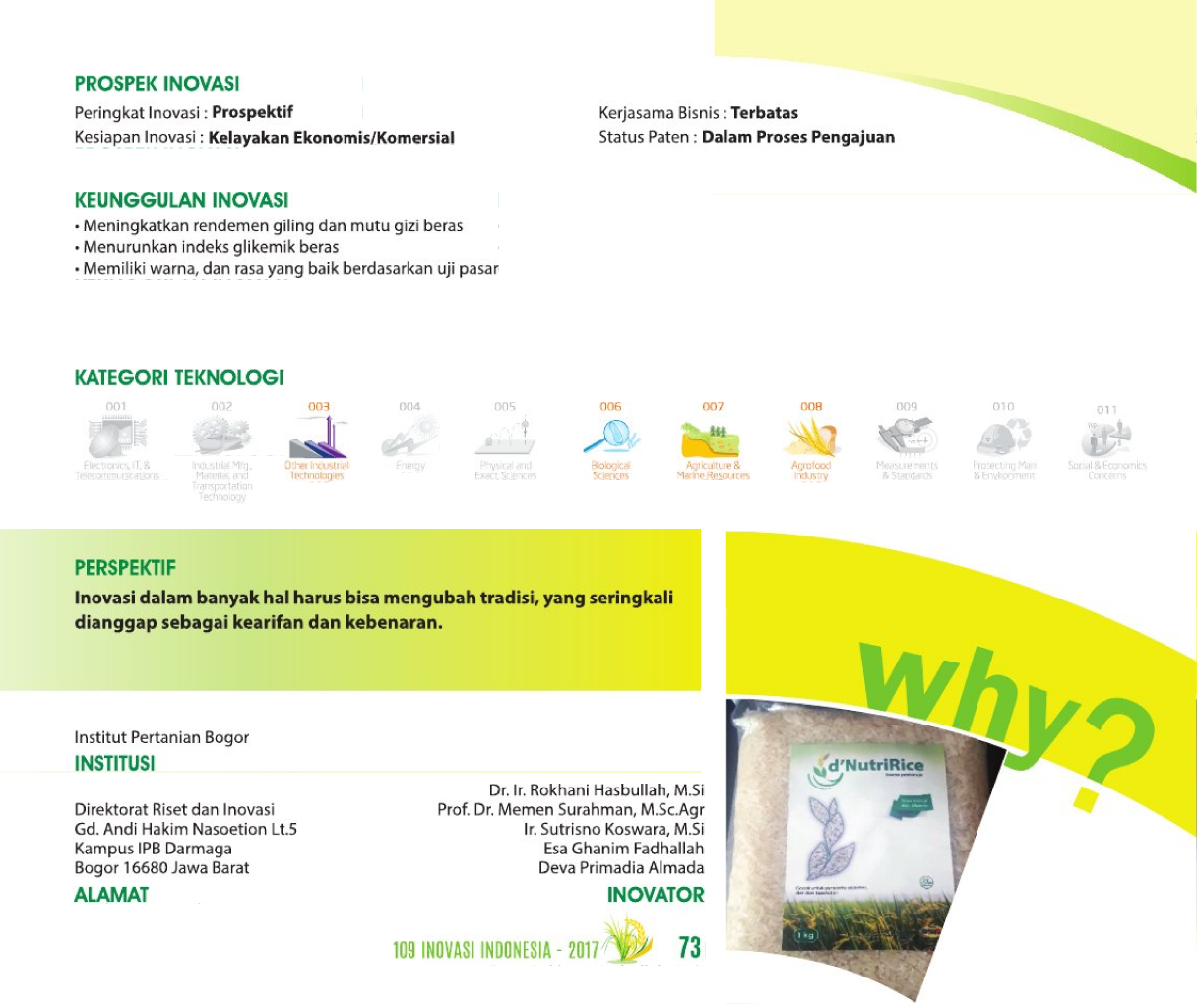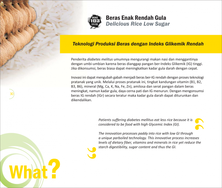 Beras Enak Rendah GulaDelicious Rice Low SugarTeknologi Produksi Beras dengan Indeks Glikemik Rendah Status Paten: Telah Terdaftar Kesiapan Inovasi: *** Telah Dikomersialkan Kerjasama Bisnis: ** Luas Peringkat Inovasi: ** Luas | |