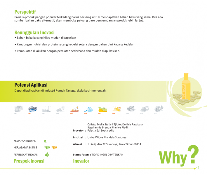 Bubur Hijau Kaya ProteinProtein Rich Green PorridgeTepung Sereal Edamame Instan Status Paten: Telah Terdaftar Kesiapan Inovasi: Kerjasama Bisnis: * Terbatas Peringkat Inovasi: * Terbatas | |