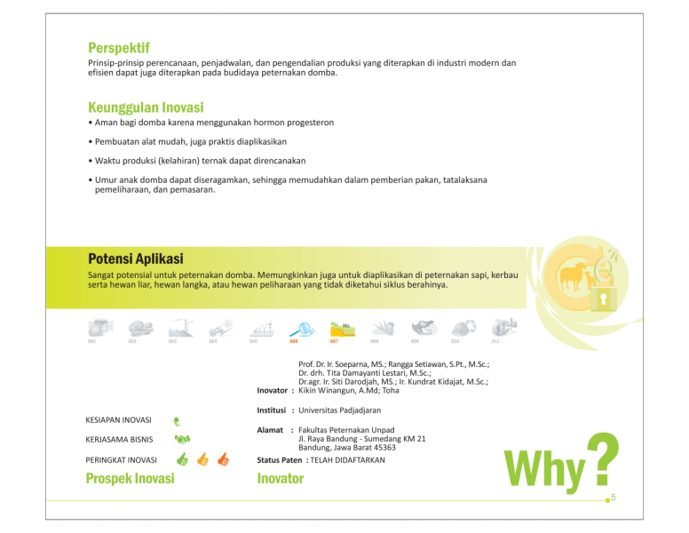 Banyak Anak Banyak Rejeki Berkat LimbahLots of Lamb, Lots of Fortune Thanks to WasteFLUSHING DENGAN MENGGUNAKAN MINYAK LEMURU PADA MANAJEMEN REPRODUKSI DOMBA LOKAL Status Paten: Dalam Proses Pengajuan Kesiapan Inovasi: ** Siap Dikomersialkan Kerjasama Bisnis: *** Terbuka Peringkat Inovasi: *** Terbuka | |
