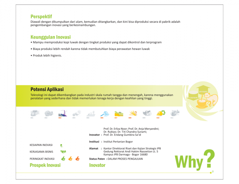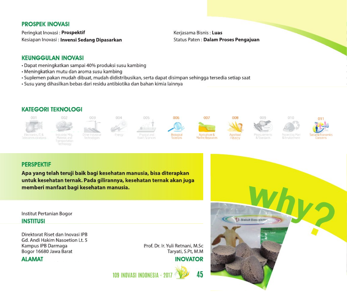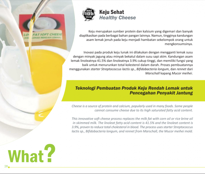 Sehatnya Keju, Susunya KambingSpecial Cheese from Special MilkProses Produksi Keju Probiotik dari Susu Kambing Status Paten: Dalam Proses Pengajuan Kesiapan Inovasi: * Prototype Kerjasama Bisnis: ** Luas Peringkat Inovasi: ** Luas | |