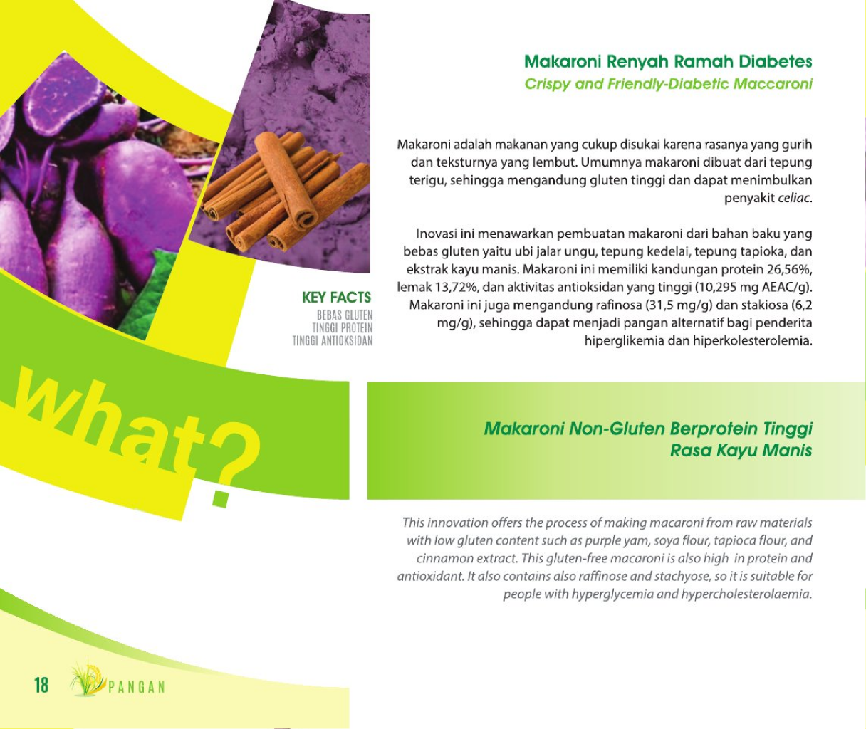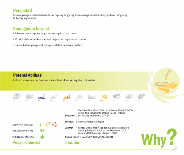 Ada Budi ada Balas, Ada Mie dari TalasReciprocal Kindness from Taro NoodleMi Taroben: Inovasi Mi Non-Gluten Rendah Indeks Glikemik dari Talas Beneng Status Paten: Dalam Proses Pengajuan Kesiapan Inovasi: * Prototype Kerjasama Bisnis: ** Luas Peringkat Inovasi: ** Luas | |