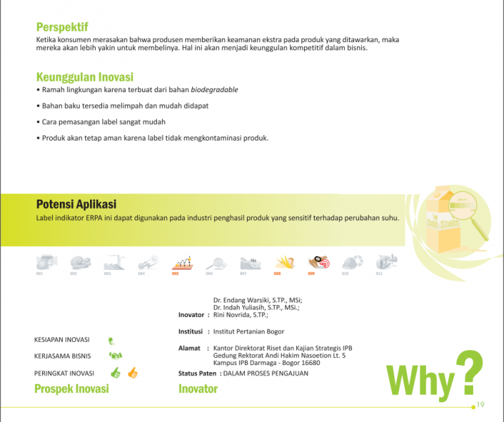 Termometer Pintar Penjamin MutuQuality Assurance Smart ThermometerLabel Indikator Warna (Aevra Sanguinolenta) Untuk Mendeteksi Kerusakan Susu Pasteurisasi dalam Kemasan Status Paten: Dalam Proses Pengajuan Kesiapan Inovasi: * Prototype Kerjasama Bisnis: * Terbatas Peringkat Inovasi: * Terbatas | |