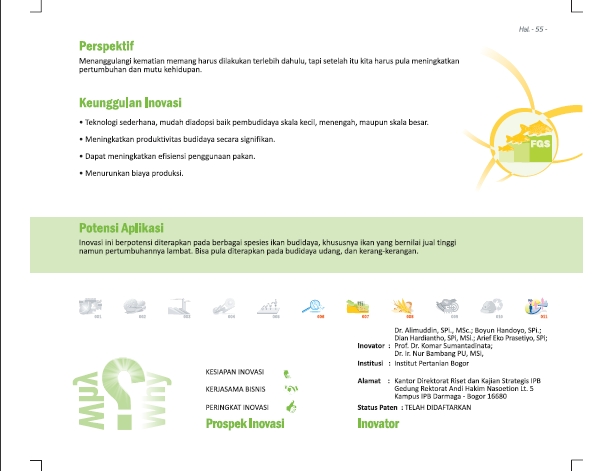 Dari Sapi untuk IkanFrom Cow for FishProduksi Pelet (Pakan Ikan, Udang, dan Unggas dari Kotoran Sapi) Status Paten: Kesiapan Inovasi: *** Telah Dikomersialkan Kerjasama Bisnis: ** Luas Peringkat Inovasi: ** Luas | |