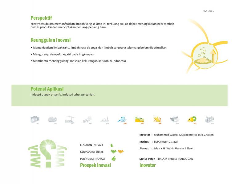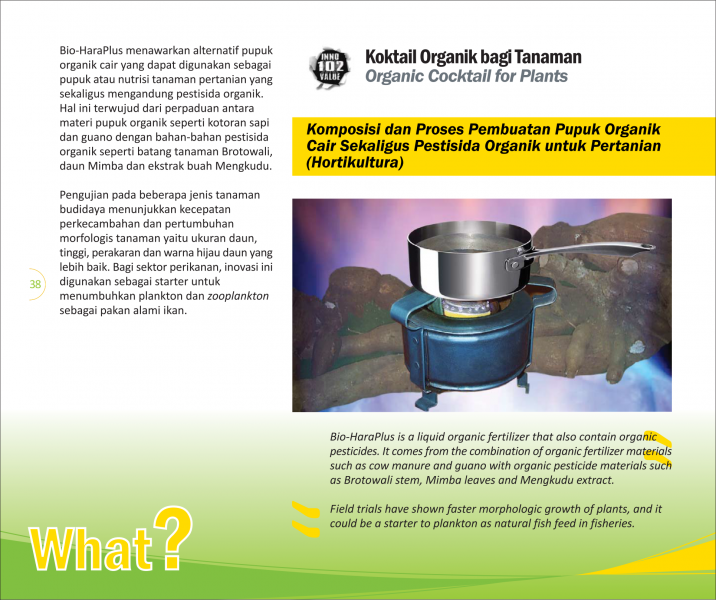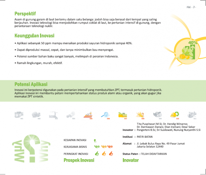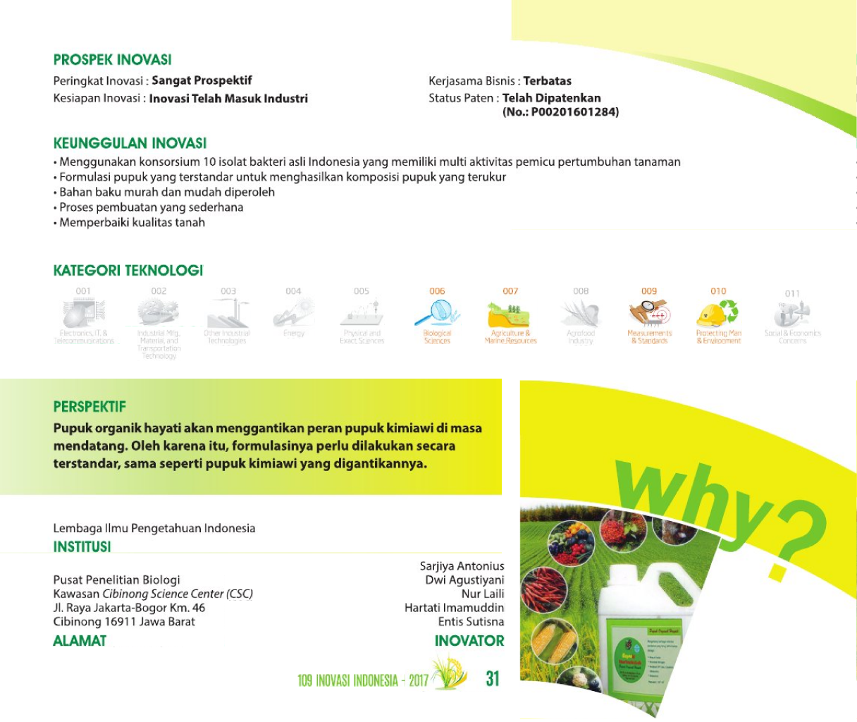 Dari Tanah, oleh Tanah, demi TanahFrom Earth, by Earth, for Earth's SakeBio-Qita Alternatif Pupuk Organik Lokal yang Murah, Mudah, dan Efisien Status Paten: Dalam Proses Pengajuan Kesiapan Inovasi: * Prototype Kerjasama Bisnis: *** Terbuka Peringkat Inovasi: *** Terbuka | |