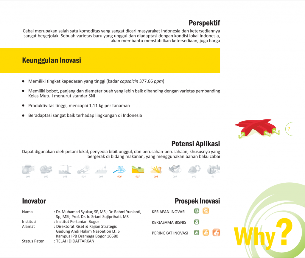 Cabai Semi Keriting MempesonaCharming Semi Curly ChiliCabai Pesona IPB: Panjang, Pedas nan Mempesona Status Paten: Telah Terdaftar Kesiapan Inovasi: ** Siap Dikomersialkan Kerjasama Bisnis: * Terbatas Peringkat Inovasi: * Terbatas | |
