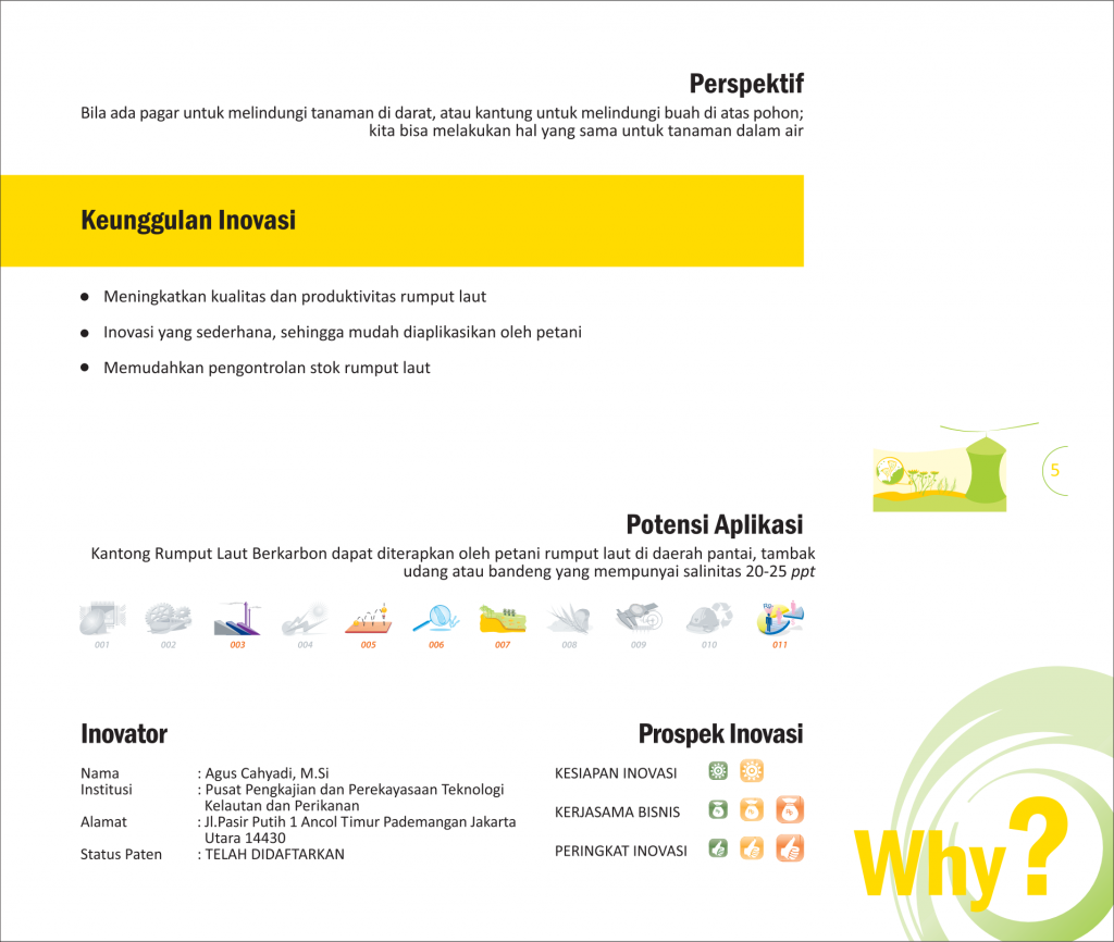 Dilarang Merumput Di LautNo Grazing In The SeaALAT PENGUSIR HAMA RUMPUT LAUT Status Paten: Belum Didaftarkan Kesiapan Inovasi: * Prototype Kerjasama Bisnis: ** Luas Peringkat Inovasi: ** Luas | |