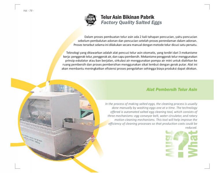 Telur Asin Bikinan PabrikFactory Quality Salted EggsAlat Pembersih Telur Asin Status Paten: Telah Terdaftar Kesiapan Inovasi: * Prototype Kerjasama Bisnis: *** Terbuka Peringkat Inovasi: *** Terbuka | |
