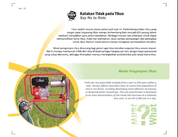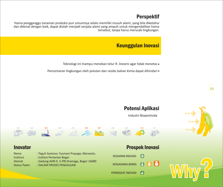 Senjata Ampuh Penumpas HamaPowerful Weapon to Defeat PestsPengendalian Hama Lalat Buah dengan Iradiasi untuk Meningkatkan Pendapatan Petani Buah-buahan Status Paten: Dalam Proses Pengajuan Kesiapan Inovasi: * Prototype Kerjasama Bisnis: ** Luas Peringkat Inovasi: ** Luas | |