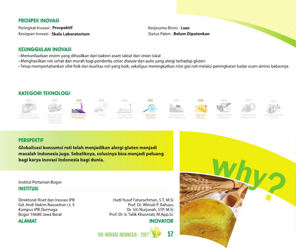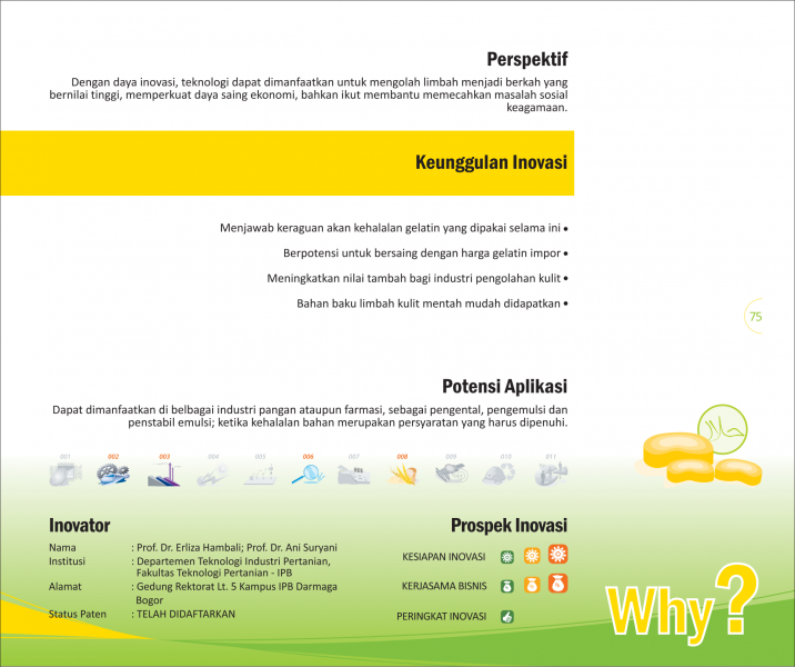 Tulang yang MenyehatkanNourishing BoneBiskuit Kaya Kalsium dari Serbuk Tulang Sapi Status Paten: Dalam Proses Pengajuan Kesiapan Inovasi: * Prototype Kerjasama Bisnis: * Terbatas Peringkat Inovasi: * Terbatas | |