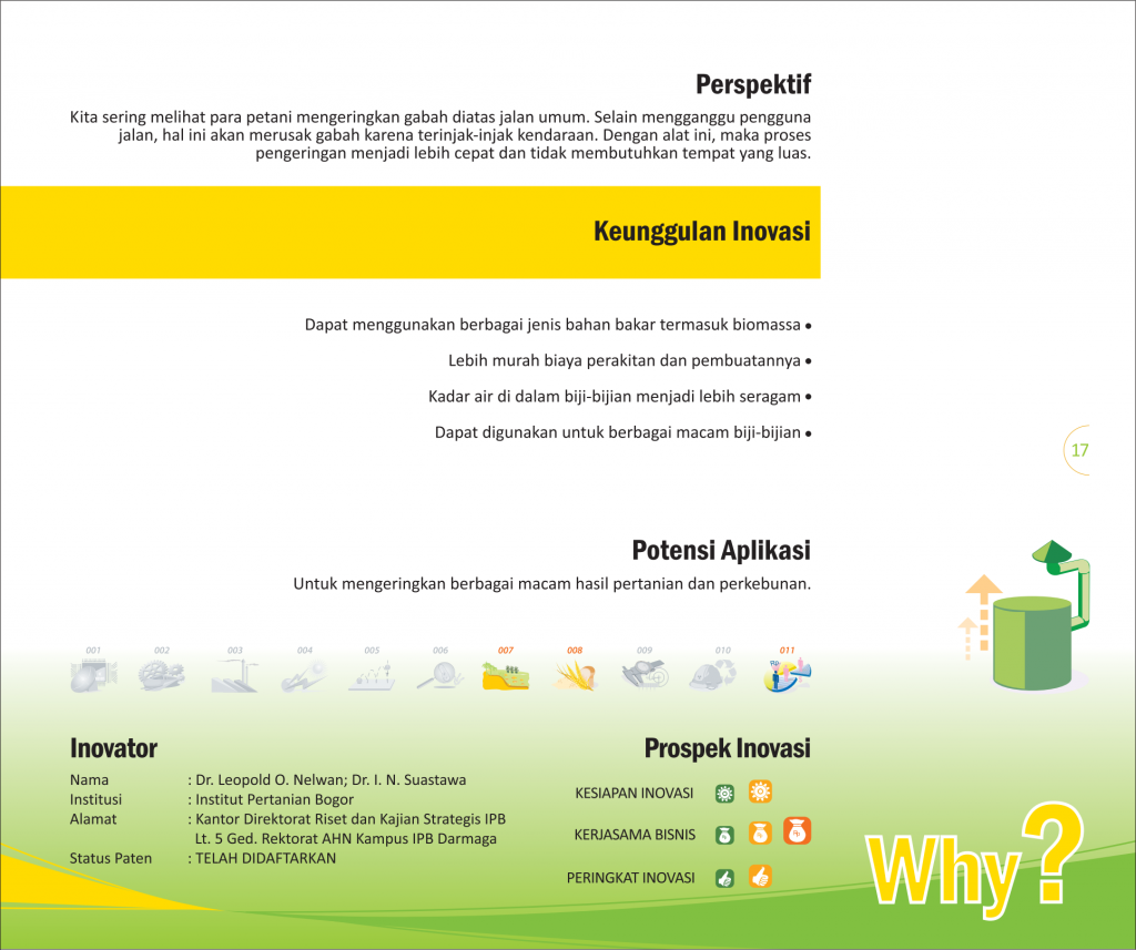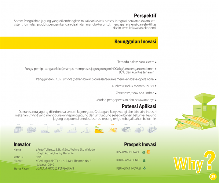 Dari Utuh, Jadi TepungFrom Whole, Into PowderUnit Pengolahan Jagung Terpadu Status Paten: Dalam Proses Pengajuan Kesiapan Inovasi: ** Siap Dikomersialkan Kerjasama Bisnis: * Terbatas Peringkat Inovasi: * Terbatas | |