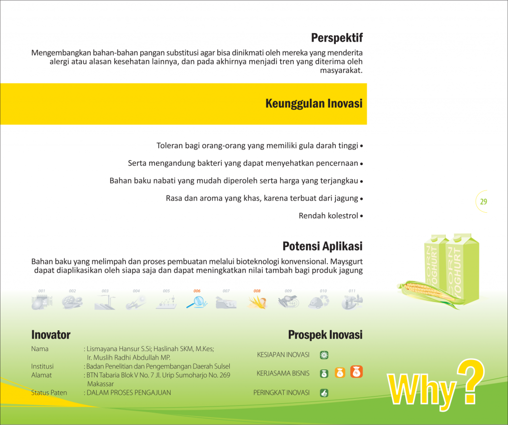 Susu Jagung YoghurtCorn Milk YogurtMaysgurt (Susu Fermentasi Jagung), Minuman Probiotik Berbasis Biodiversity Status Paten: Dalam Proses Pengajuan Kesiapan Inovasi: * Prototype Kerjasama Bisnis: *** Terbuka Peringkat Inovasi: *** Terbuka | |