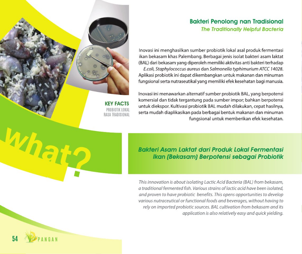 Bakteri Penolong nan TradisionalThe Traditionally Helpful BacteriaBakteri Asam Laktat dari Produk Lokal Fermentasi Ikan (Bekasam) Berpotensi sebagai Probiotik Status Paten: Dalam Proses Pengajuan Kesiapan Inovasi: Kerjasama Bisnis: ** Luas Peringkat Inovasi: ** Luas | |
