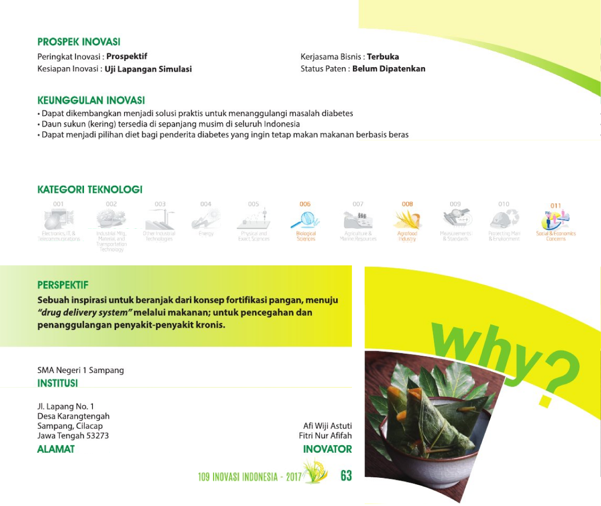 Ubi Manis Anti Kencing ManisAnti Diabetic Sweet PotatoCookies Pasta UJU untuk Penderita Diabetes Status Paten: Dalam Proses Pengajuan Kesiapan Inovasi: * Prototype Kerjasama Bisnis: *** Terbuka Peringkat Inovasi: *** Terbuka | |