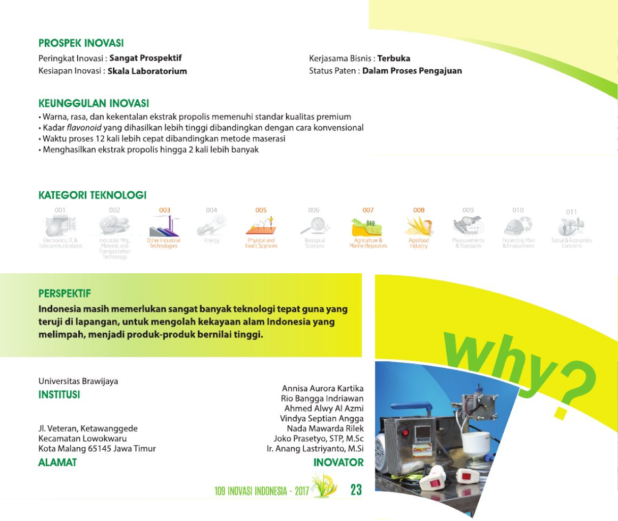 Siapa Cepat, Propolis DapatWho First Come, Propolis First ServeAUTHOR (Automatic Bee Propolis Heat Extractor): Inovasi Rancang Bangun Ekstraktor Propolis Berbasis ReHeater (Resistive Heating with Vacuum Filter) Status Paten: Dalam Proses Pengajuan Kesiapan Inovasi: Kerjasama Bisnis: *** Terbuka Peringkat Inovasi: *** Terbuka | |