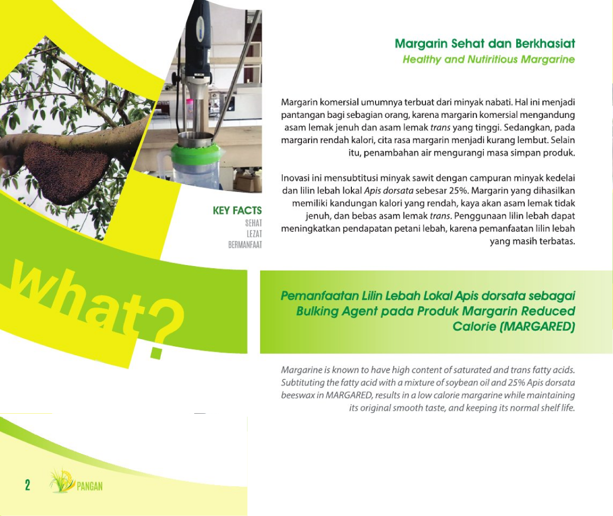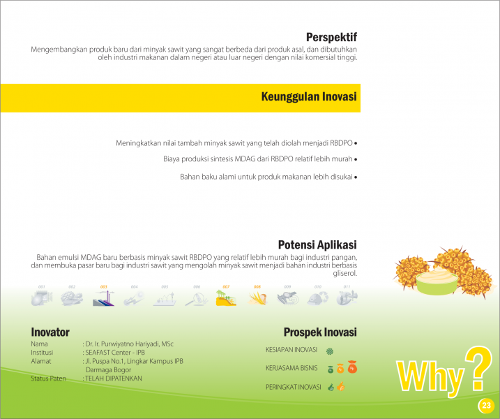 Sisa Sawit yang BernilaiValuable Palm WasteProduksi Monogliserida (MAG) sebagai Emulsifier Beras Analog dari Biodiesel Status Paten: Dalam Proses Pengajuan Kesiapan Inovasi: Kerjasama Bisnis: * Terbatas Peringkat Inovasi: * Terbatas | |