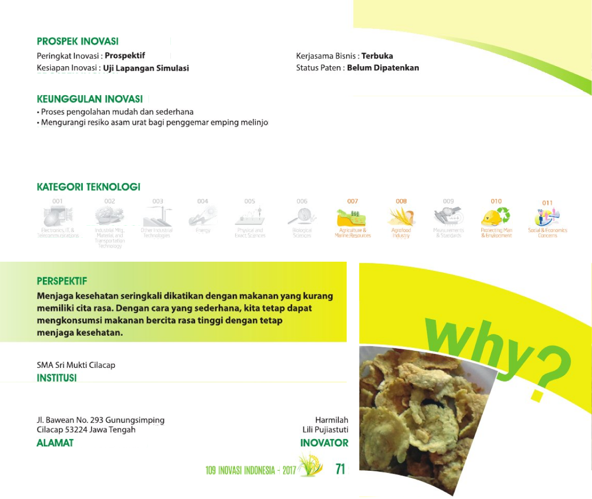 Yang Asin Yang Asin Yang AmanSalty Salty Safe SurelyTELUR ASIN TANPA ALERGI Status Paten: Belum Didaftarkan Kesiapan Inovasi: * Prototype Kerjasama Bisnis: ** Luas Peringkat Inovasi: ** Luas | |