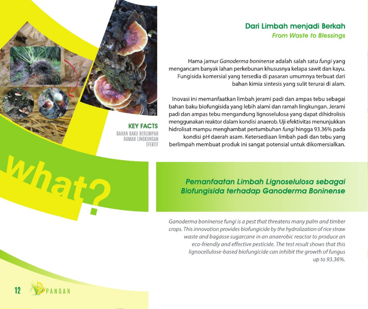 Dari Limbah menjadi BerkahFrom Waste to BlessingsPemanfaatan Limbah Lignoselulosa sebagai Biofungisida terhadap Ganoderma Boninense Status Paten: Dalam Proses Pengajuan Kesiapan Inovasi: Kerjasama Bisnis: * Terbatas Peringkat Inovasi: * Terbatas | |