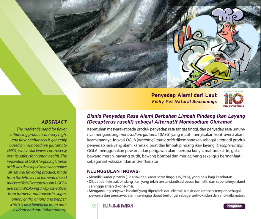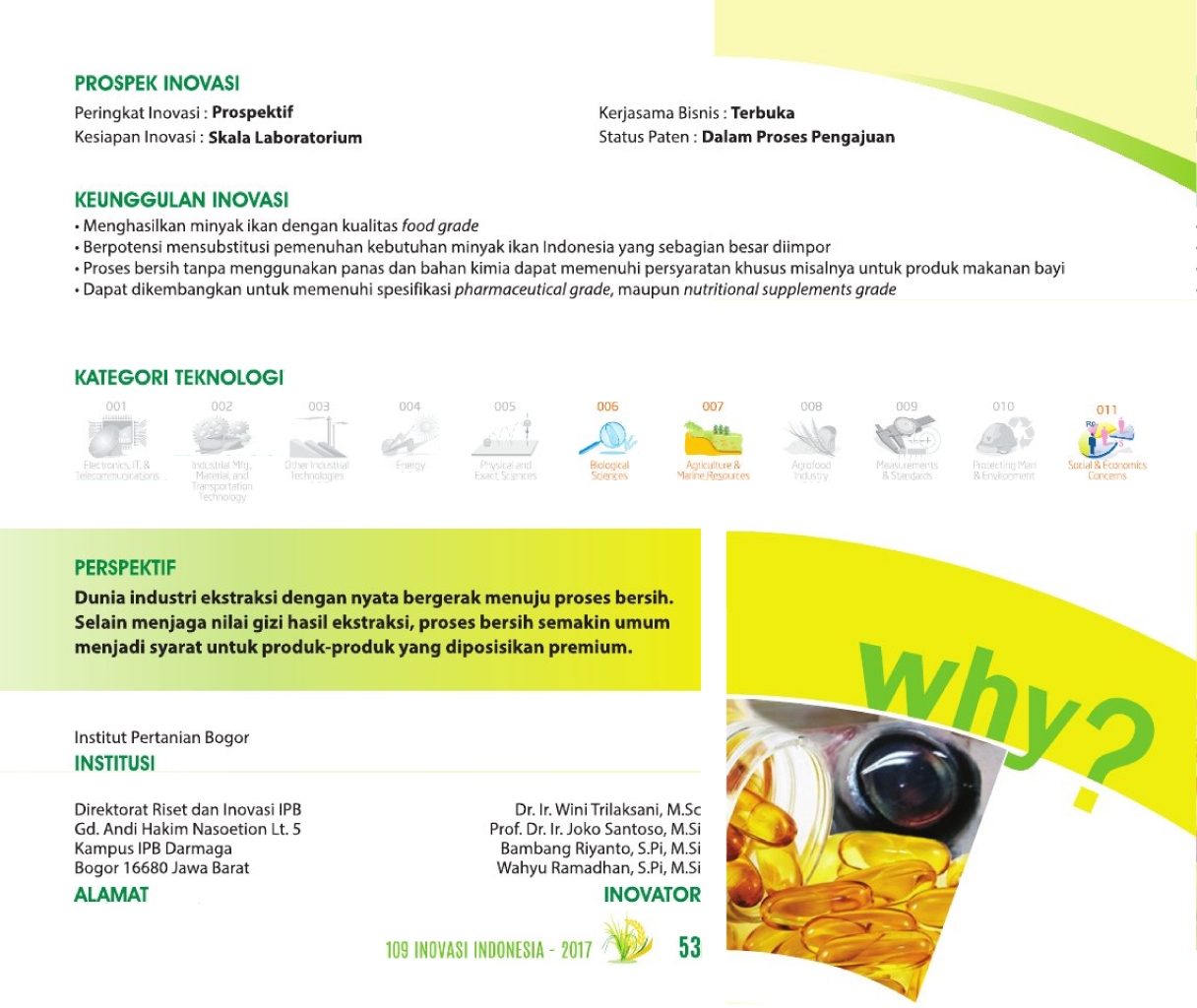 Di Matamu Kulihat MinyakI See Oil in Your EyesVirgin Fish Oil Essential Fatty Acid Mata Ikan Tuna: Adaptasi Produksi Bersih dan Optimasi Proses Ekstraksi dalam Marking Food Grade Fish Oil sebagai Solusi Alternatif Sumber Bahan Baku Masa Depan Minyak Ikan Indonesia Status Paten: Dalam Proses Pengajuan Kesiapan Inovasi: Kerjasama Bisnis: *** Terbuka Peringkat Inovasi: *** Terbuka | |