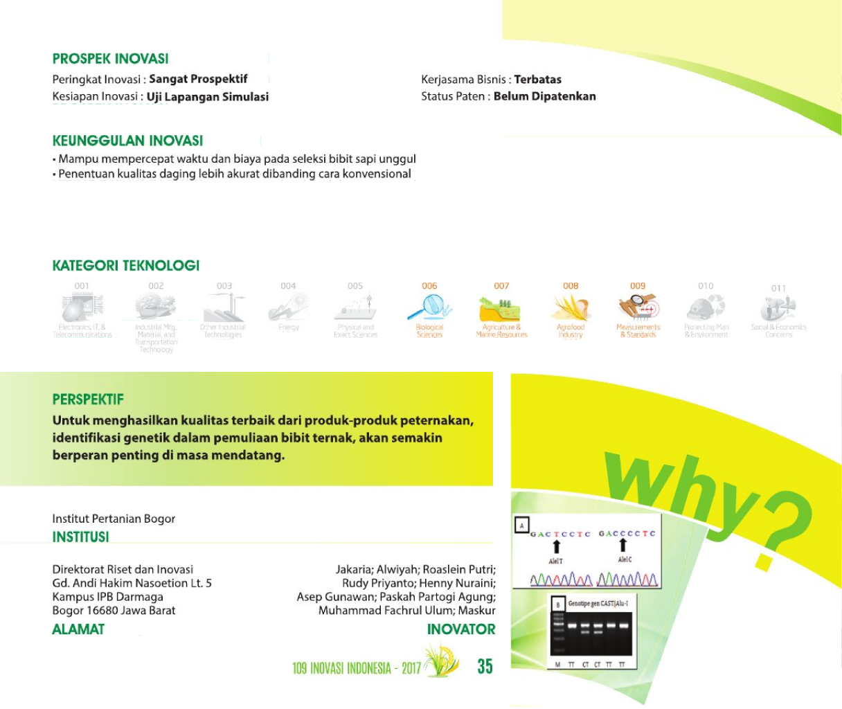 Daging Terbaik dari Gen TerbaikBest Beef from Best GenesSeleksi Cepat dan Akurat Sifat Kualitas Daging pada Sapi Bali Menggunakan Penanda Molekuler Gen Stearoyl-Coa Desaturase (SCD) dan Gen Calpastatin (CAST) Status Paten: Dalam Proses Pengajuan Kesiapan Inovasi: Kerjasama Bisnis: * Terbatas Peringkat Inovasi: * Terbatas | |