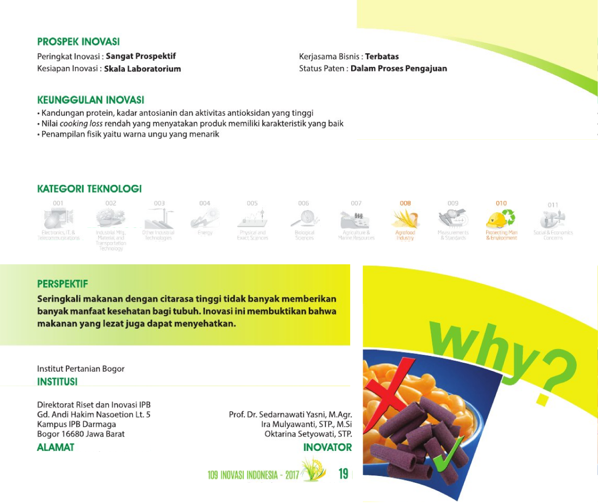 Sosis Nabati nan BergiziNutritious Vegetarian SausageSosis Kacang Merah Status Paten: Kesiapan Inovasi: * Prototype Kerjasama Bisnis: * Terbatas Peringkat Inovasi: * Terbatas | |