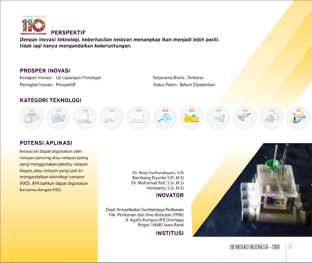 Tangkap Ikan Pakai SuaraCatch The Fish with SoundRumpon Portabel sebagai Alat Bantu Penangkapan Ikan Ramah Lingkungan Status Paten: Dalam Proses Pengajuan Kesiapan Inovasi: Kerjasama Bisnis: * Terbatas Peringkat Inovasi: * Terbatas | |
