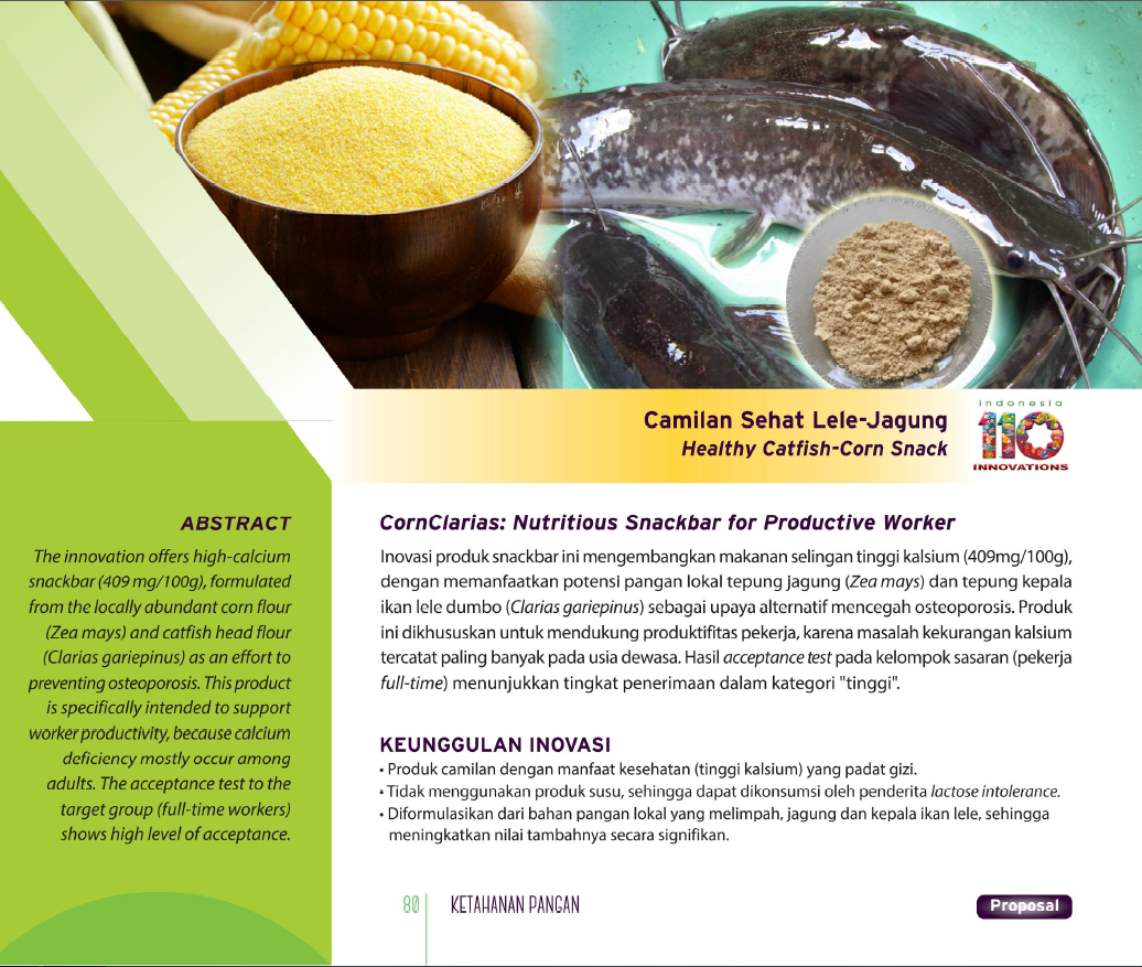Camilan Sehat Lele-JagungHealthy Catfish-Corn SnackCornClarias: Nutritious Snackbar for Productive Worker Status Paten: Belum Didaftarkan Kesiapan Inovasi: * Prototype Kerjasama Bisnis: * Terbatas Peringkat Inovasi: * Terbatas | |