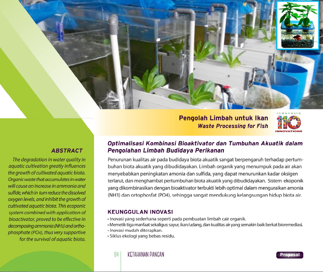 Akar Wangi untuk Kesehatan IkanVetiver for Fish HealthFITOREMEDIASI MENGGUNAKAN AKAR WANGI (VETIVERIA ZIZANIOIDES) DALAM PENGOLAHAN LIMBAH CAIR ORGANIK PERIKANAN Status Paten: Belum Didaftarkan Kesiapan Inovasi: * Prototype Kerjasama Bisnis: * Terbatas Peringkat Inovasi: * Terbatas | |