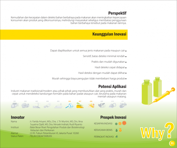 Detektif Formalin.Formalin Detective.Reagen Penguji (Test Kit) Residu Formalin Pada Makanan Status Paten: Telah Terdaftar Kesiapan Inovasi: *** Telah Dikomersialkan Kerjasama Bisnis: ** Luas Peringkat Inovasi: ** Luas | |