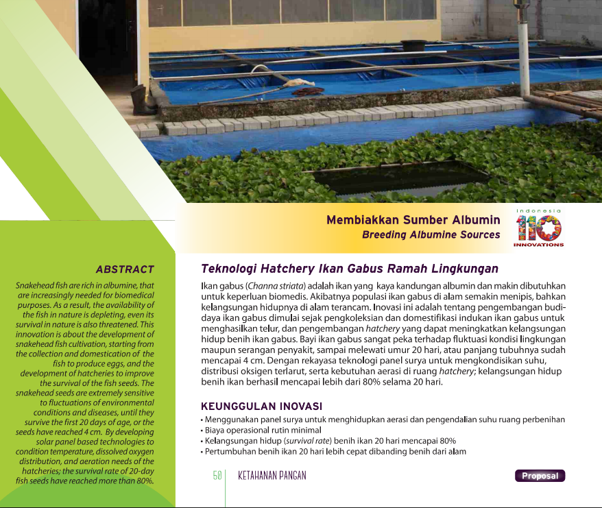 Benih Ikan Kapan-KapanFish Seeds at AnytimePengembangan Bahan Stimulasi Pematangan Gonad Ovulasi dan Pemijahan Ikan untuk Peningkatan Produksi Benih Ikan Budidaya Status Paten: Dalam Proses Pengajuan Kesiapan Inovasi: Kerjasama Bisnis: ** Luas Peringkat Inovasi: ** Luas | |