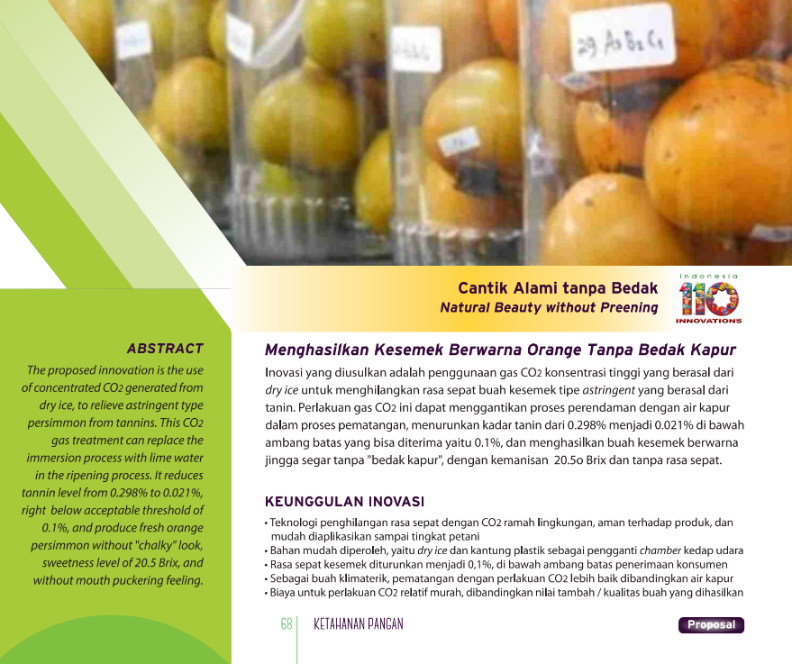 Cantik Alami tanpa BedakNatural Beauty without PreeningMenghasilkan Kesemek Berwarna Orange Tanpa Bedak Kapur Status Paten: Belum Didaftarkan Kesiapan Inovasi: * Prototype Kerjasama Bisnis: * Terbatas Peringkat Inovasi: * Terbatas | |