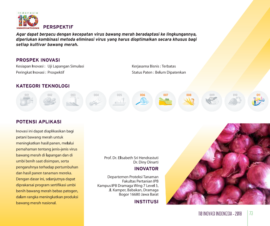 Bibit Bawang Bebas VirusVirus Free Onion SeedStatus Penyakit Virus Pada Umbi Bawang Merah dan Upaya Eliminasi Virus Melalui Termoterapi dan Kemoterapi Status Paten: Belum Didaftarkan Kesiapan Inovasi: * Prototype Kerjasama Bisnis: * Terbatas Peringkat Inovasi: * Terbatas | |