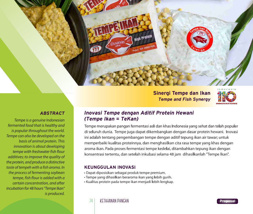 Sinergi Tempe dan IkanTempe and Fish SynergyInovasi Tempe dengan aditif protein hewani (Tempe Ikan = TeKan) Status Paten: Telah Terdaftar Kesiapan Inovasi: * Prototype Kerjasama Bisnis: * Terbatas Peringkat Inovasi: * Terbatas | |