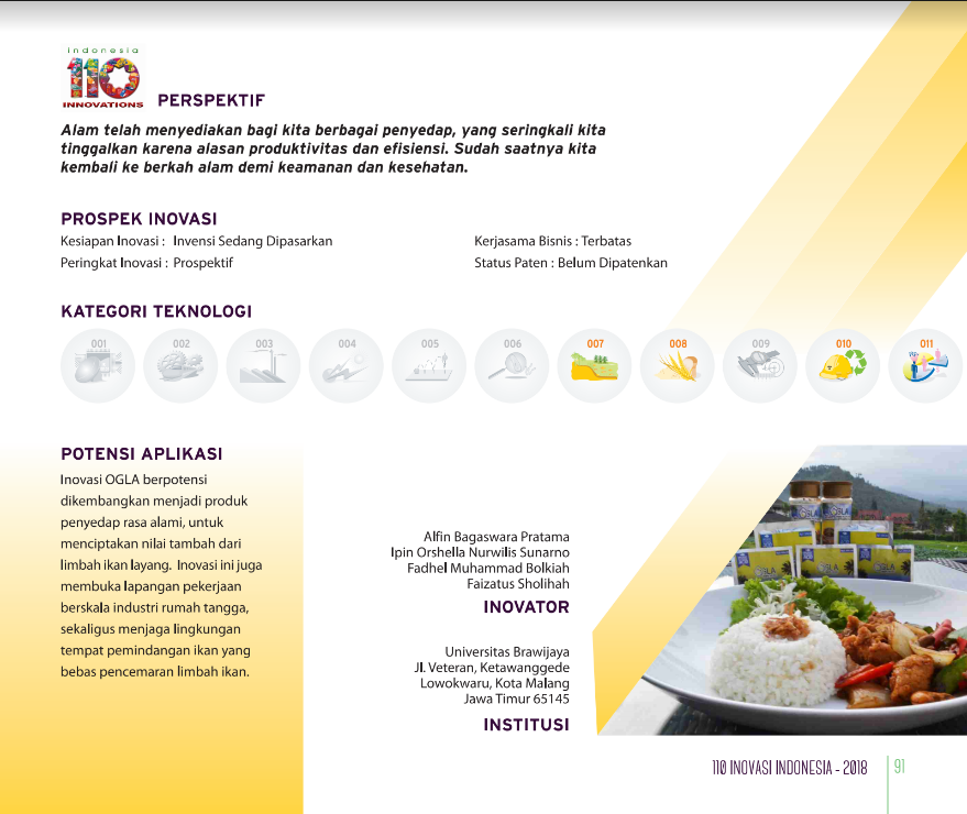 Sinergi Sehat Laut dan DaratLand-Ocean Healthy SynergySediaan Padat Pangan Fungsional Melalui Mikroenkapsulasi Asam Lemak Esensial dan Antioksidan Berbasis Hasil Laut dan Rempah Tropika Status Paten: Dalam Proses Pengajuan Kesiapan Inovasi: Kerjasama Bisnis: ** Luas Peringkat Inovasi: ** Luas | |