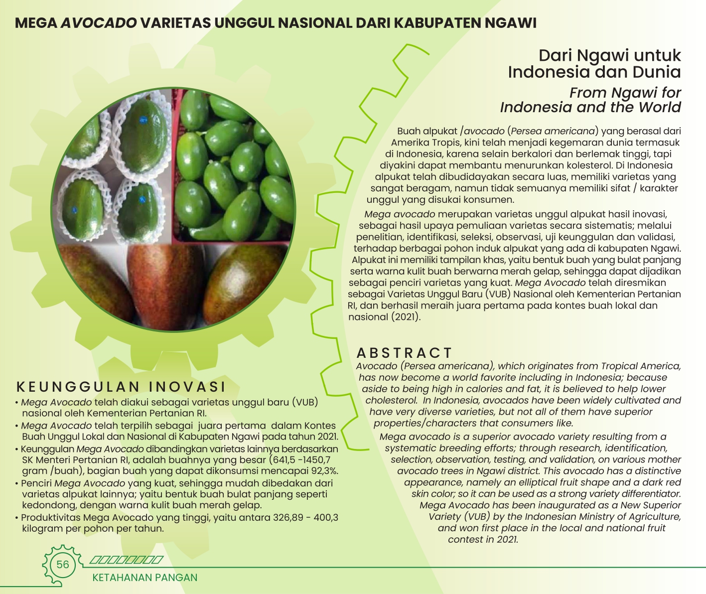 Dari Ngawi untuk Indonesia dan DuniaFrom Ngawi for Indonesia and the WorldMEGA AVOCADO VARIETAS UNGGUL NASIONAL DARI KABUPATEN NGAWI Status Paten: Tidak Ingin Didaftarkan Kesiapan Inovasi: ** Siap Dikomersialkan Kerjasama Bisnis: * Terbatas Peringkat Inovasi: * Terbatas | |