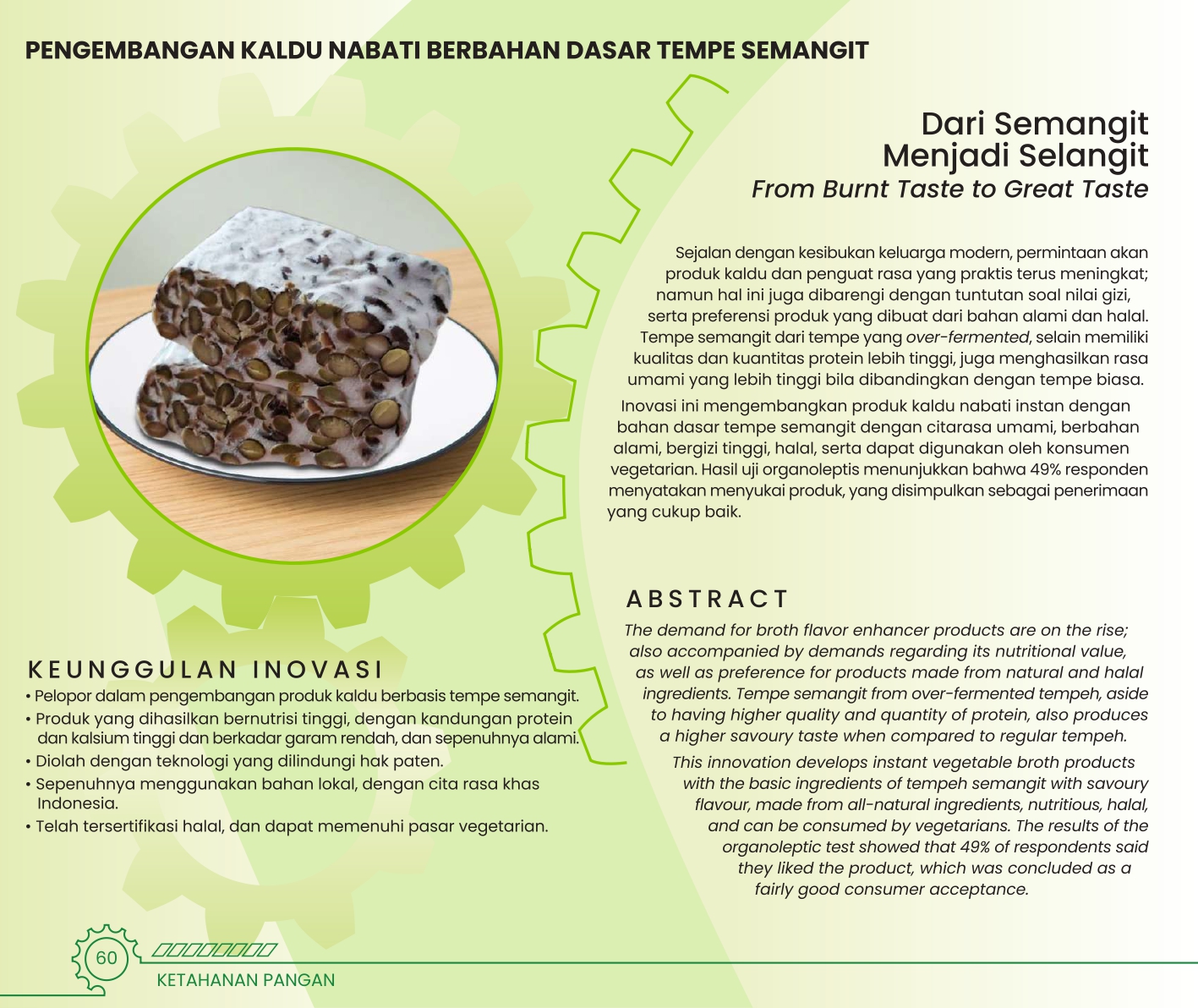 Dari Semangit Menjadi SelangitFrom Burnt Taste to Great TastePENGEMBANGAN KALDU NABATI BERBAHAN DASAR TEMPE SEMANGIT Status Paten: Telah Terdaftar Kesiapan Inovasi: *** Telah Dikomersialkan Kerjasama Bisnis: *** Terbuka Peringkat Inovasi: *** Terbuka | |