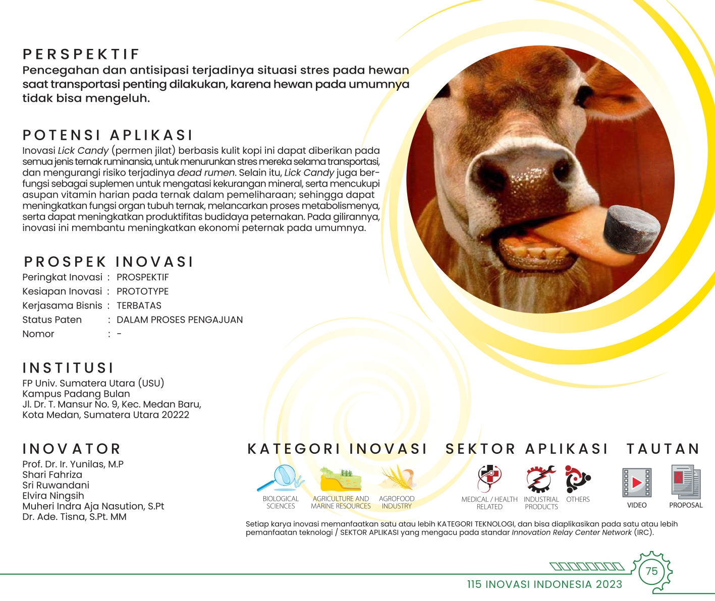 Beri Permen Biar Tenang dan SenangMake Them Calm and Happy with CandyLICK CANDY: PERMEN JILAT BERBASIS KULIT KOPI UNTUK MENGATASI STRES PADA TERNAK SELAMA TRANSPORTASI Status Paten: Belum Didaftarkan Kesiapan Inovasi: * Prototype Kerjasama Bisnis: * Terbatas Peringkat Inovasi: * Terbatas | |