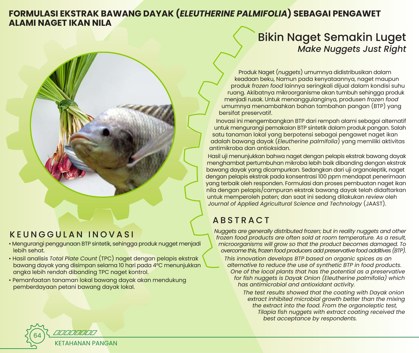Bikin Naget Semakin LugetMake Nuggets Just RightFORMULASI EKSTRAK BAWANG DAYAK (ELEUTHERINE PALMIFOLIA) SEBAGAI PENGAWET ALAMI NAGET IKAN NILA Status Paten: Dalam Proses Pengajuan Kesiapan Inovasi: * Prototype Kerjasama Bisnis: * Terbatas Peringkat Inovasi: * Terbatas | |