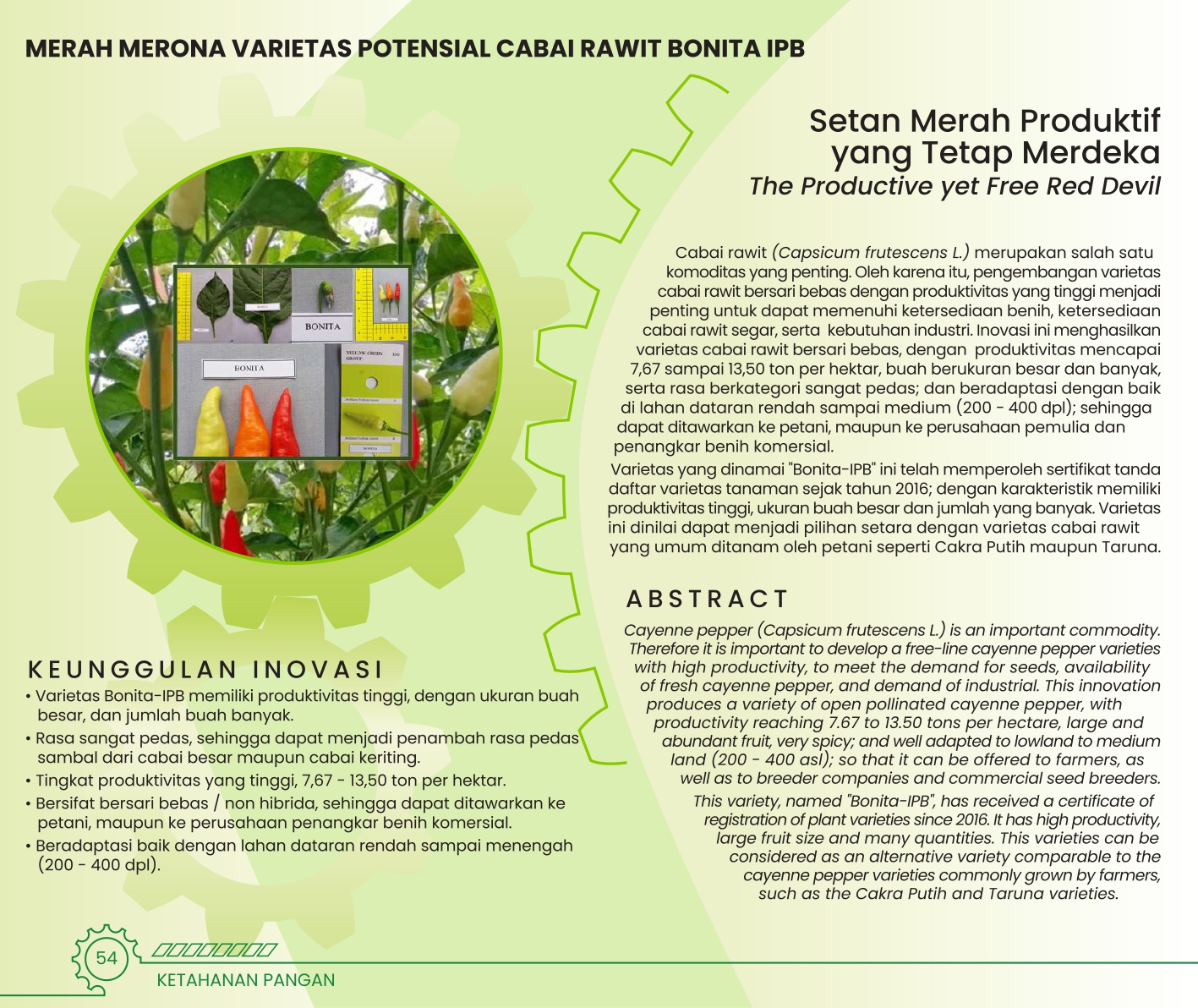 Setan Merah Produktif yang Tetap MerdekaThe Productive yet Free Red DevilMERAH MERONA VARIETAS POTENSIAL CABAI RAWIT BONITA IPB Status Paten: Telah Terdaftar Kesiapan Inovasi: *** Telah Dikomersialkan Kerjasama Bisnis: * Terbatas Peringkat Inovasi: * Terbatas | |