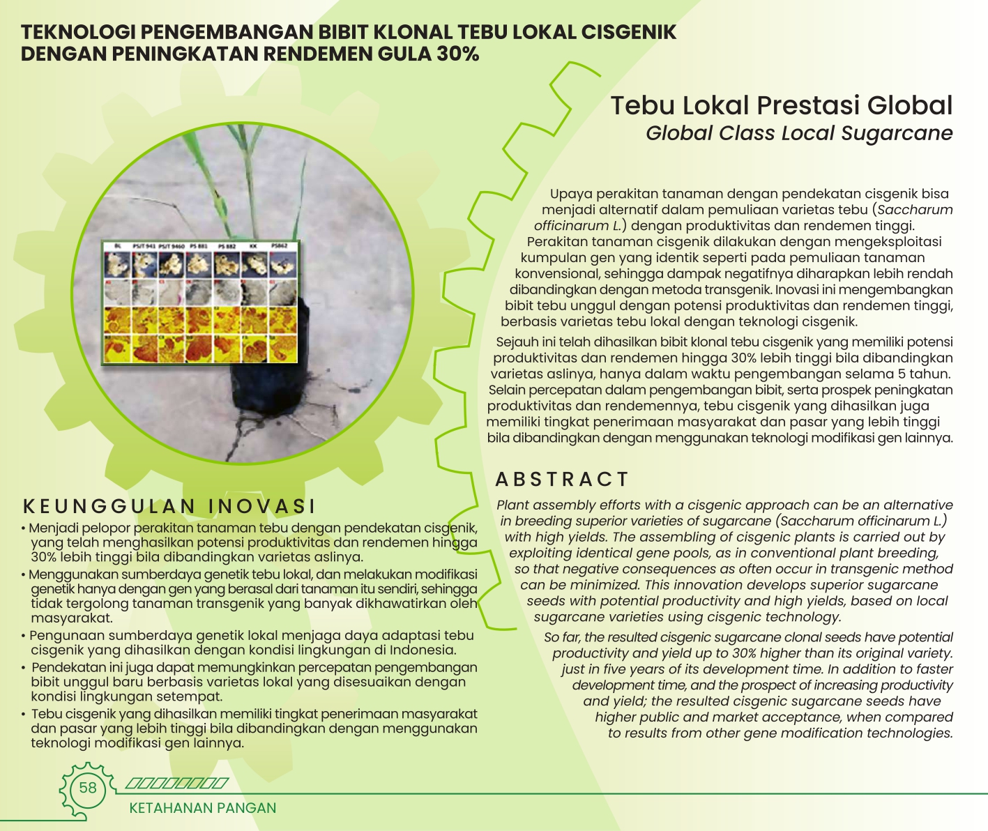 Tebu Lokal Prestasi GlobalGlobal Class Local SugarcaneTEKNOLOGI PENGEMBANGAN BIBIT KLONAL TEBU LOKAL CISGENIK DENGAN PENINGKATAN RENDEMEN GULA 30% Status Paten: Belum Didaftarkan Kesiapan Inovasi: * Prototype Kerjasama Bisnis: ** Luas Peringkat Inovasi: ** Luas | |