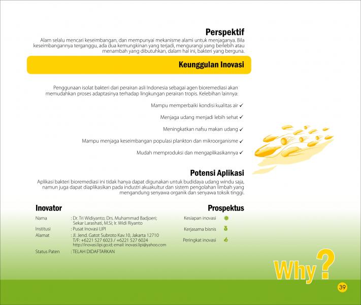 Bakteri Penjaga Kualitas AirWater Quality Maintainer BacteriaBioremediasi sebagai Alternatif Solusi pada Budidaya Udang Windu (Penaeus monodon Fab.) Status Paten: Kesiapan Inovasi: * Prototype Kerjasama Bisnis: ** Luas Peringkat Inovasi: ** Luas | |