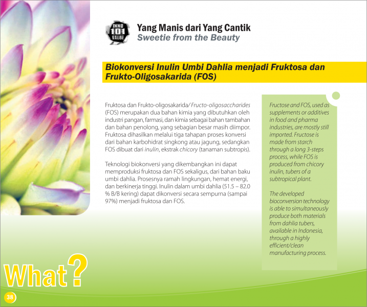 Yang Manis dari Yang CantikSweetie from the BeautyBiokonversi Inulin Umbi Dahlia menjadi Fruktosa dan Frukto-Oligosakarida (FOS) Status Paten: Telah Terdaftar Kesiapan Inovasi: * Prototype Kerjasama Bisnis: * Terbatas Peringkat Inovasi: * Terbatas | |