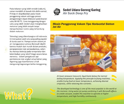 Sedot Udara Goreng GaringAir Suck Deep FryMesin Penggoreng Vakum Tipe Horizotal Sistem Jet Air Status Paten: Telah Terdaftar Kesiapan Inovasi: *** Telah Dikomersialkan Kerjasama Bisnis: * Terbatas Peringkat Inovasi: * Terbatas | |