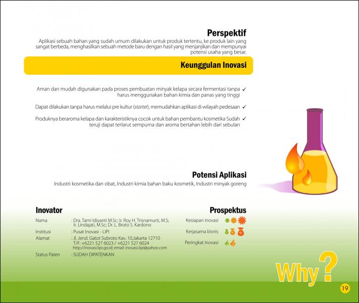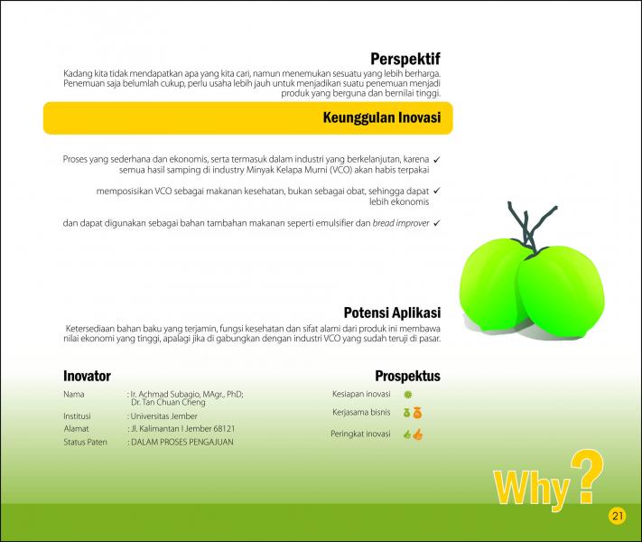 Yang Cemerlang dari yang TerbuangBrilliant Use of RefuseNanoenkapsulat Pigmen Karoten Limbah Serat Kelapa Sawit Status Paten: Telah Terdaftar Kesiapan Inovasi: * Prototype Kerjasama Bisnis: *** Terbuka Peringkat Inovasi: *** Terbuka | |