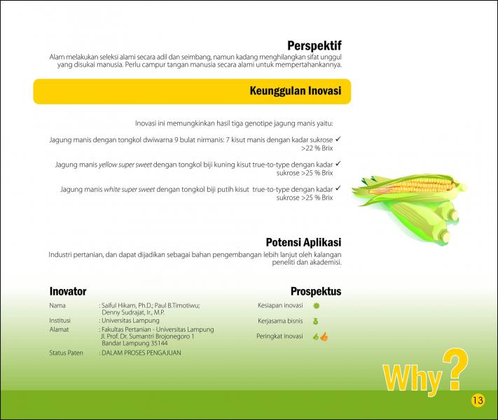 Semua Dalam Setongkol JagungAll in A Corncob"Semua Dalam Satu Tongkol Jagung": Varietas Jagung yang Punya Semua untuk Menjamin Kedaulatan Benih Status Paten: Dalam Proses Pengajuan Kesiapan Inovasi: Kerjasama Bisnis: * Terbatas Peringkat Inovasi: * Terbatas | |