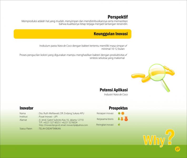 Tanggulangi Bakteri dengan BakteriTackle Bacteria with BacteriaBAKTERIOSIN DARI BAKTERI ASAM LAKTAT SEBAGAI BIOPRESERVATIF Status Paten: Dalam Proses Pengajuan Kesiapan Inovasi: * Prototype Kerjasama Bisnis: ** Luas Peringkat Inovasi: ** Luas | |