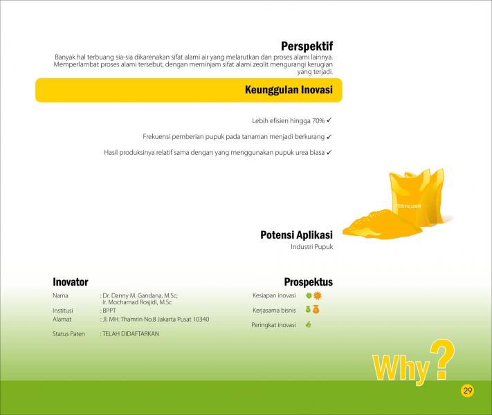 Celengan Pupuk ZeolitZeolite Fertilizer SaversTeknologi Proses Pembuatan Slow Release Fertilizer Menggunakan Zeolit Alam Status Paten: Telah Terdaftar Kesiapan Inovasi: ** Siap Dikomersialkan Kerjasama Bisnis: ** Luas Peringkat Inovasi: ** Luas | |