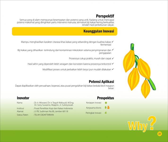 Coklat Enak dari Kakao RakyatQuality Cocoa from Smallholder ProductionTeknologi Peningkatan Mutu Kakao Non Fermentasi Melalui Reaktifasi Enzim-enzim Kunci dan Aplikasi Bakteri Asam Laktat Status Paten: Telah Terdaftar Kesiapan Inovasi: * Prototype Kerjasama Bisnis: *** Terbuka Peringkat Inovasi: *** Terbuka | |